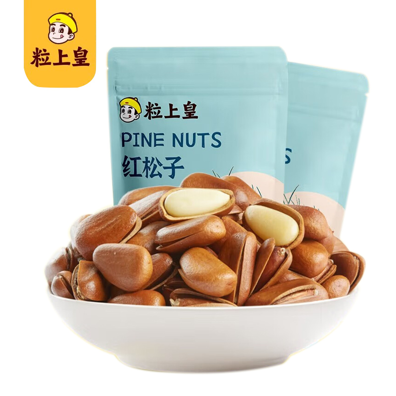 商品名称:粒上皇 红松子坚果炒货干果办公休闲零食开口手剥红松子原味 红松子208g*2袋 单位:组