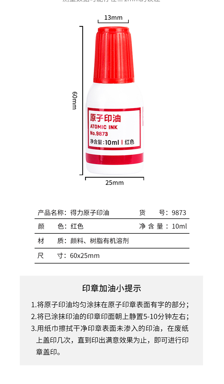 商品名称:得力-9873-原子印油-红-单位:瓶-起订量10瓶