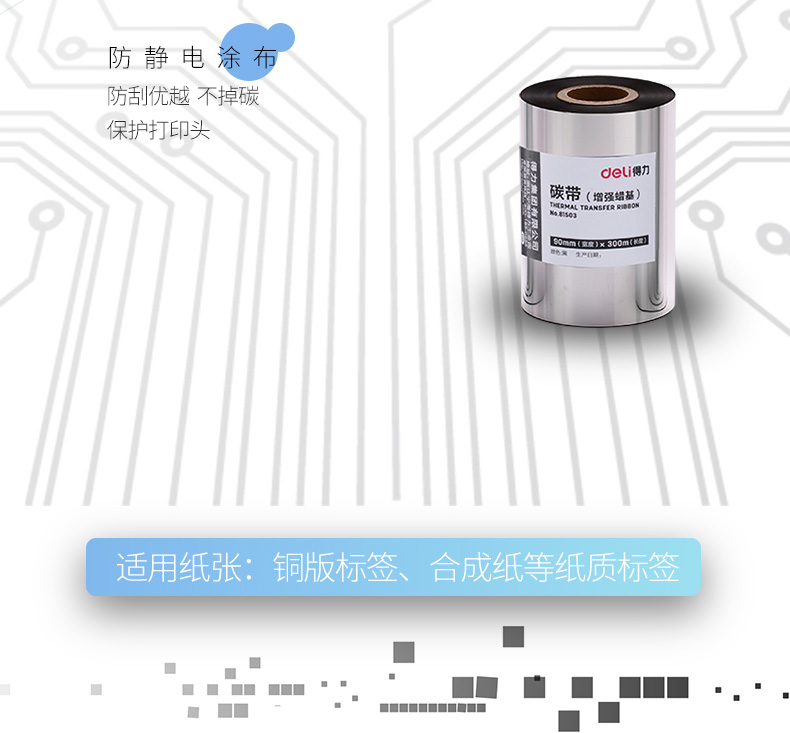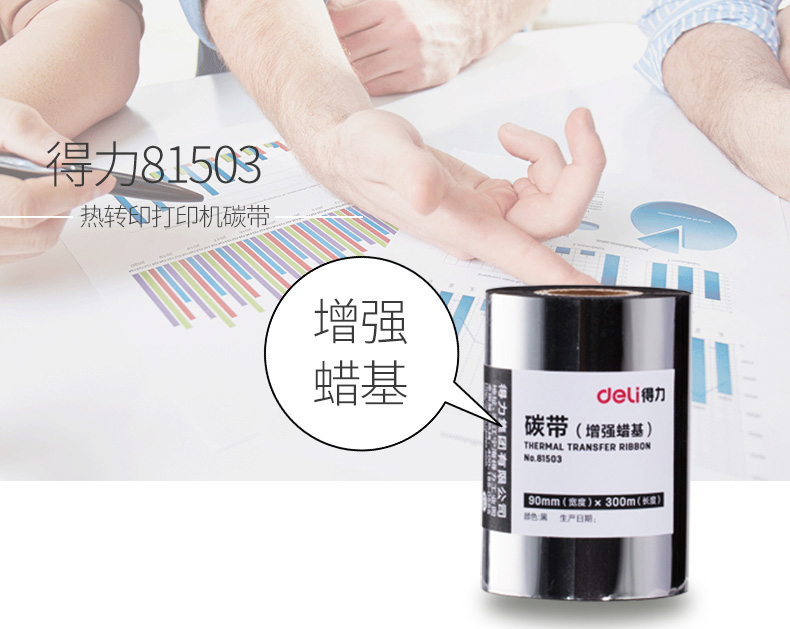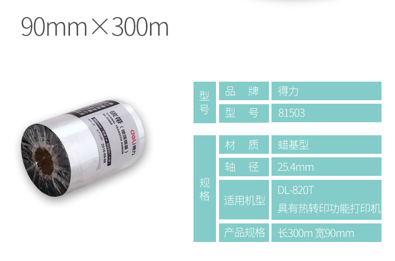 商品名称:得力 81503 增强蜡基碳带90mm*300m条码纸不干胶标签打印耗材铜版纸增强色带热转印蜡基碳带