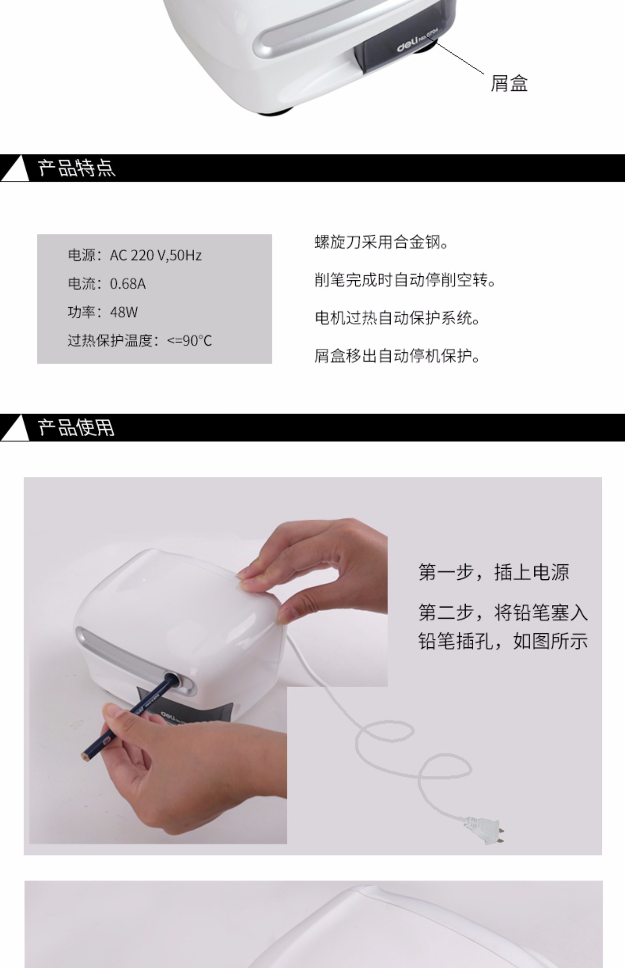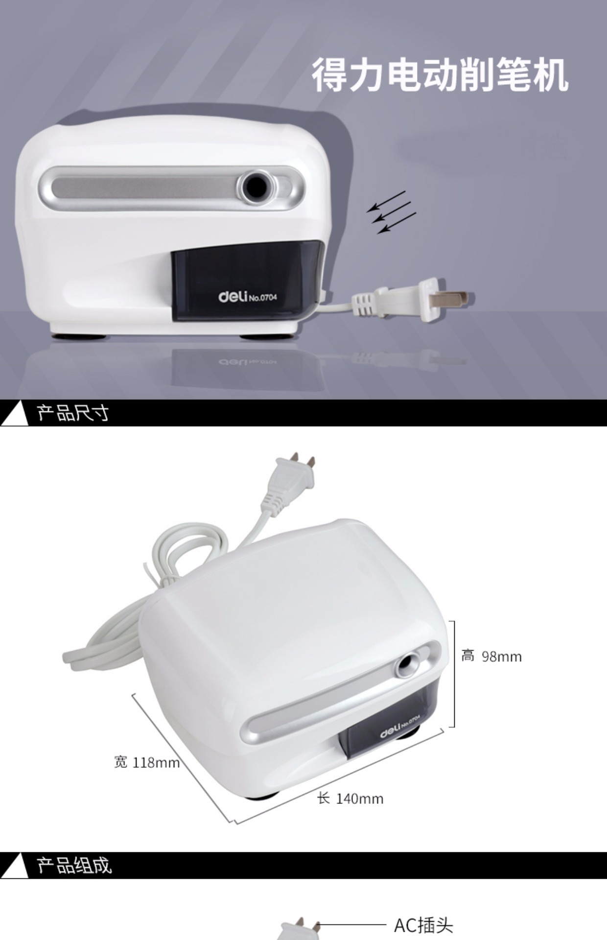 商品名称:得力 0704卷笔刀电动削笔器 全自动转笔刀铅笔刀 小学生铅笔削笔机