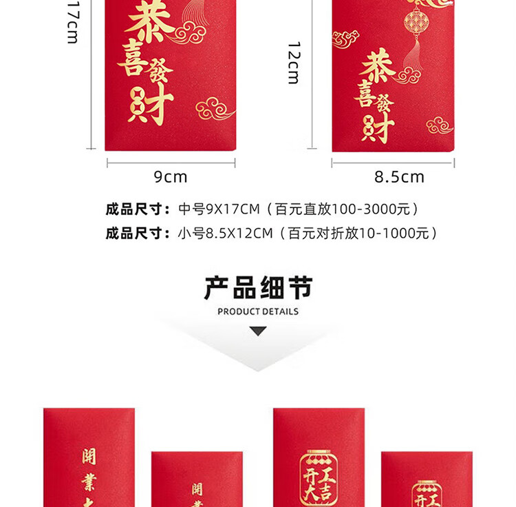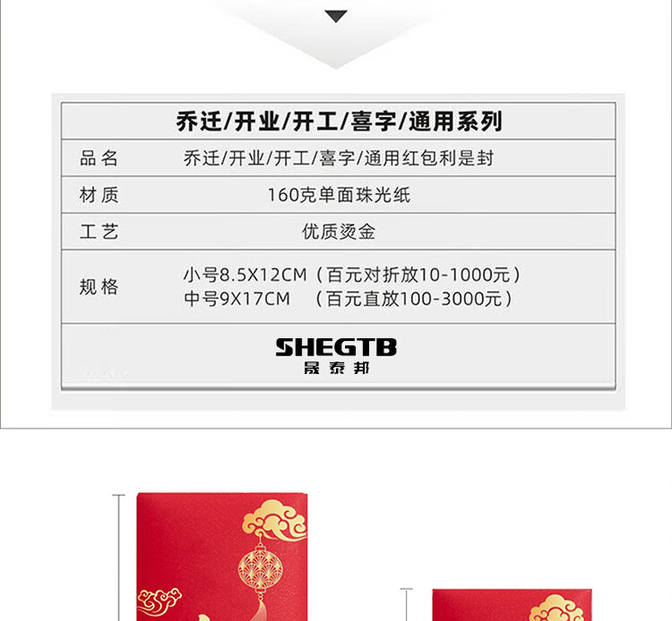 商品名称:晟泰邦 新年大吉大利通用款烫金利是封红包 恭喜发财 小号【12个装】 单位:包