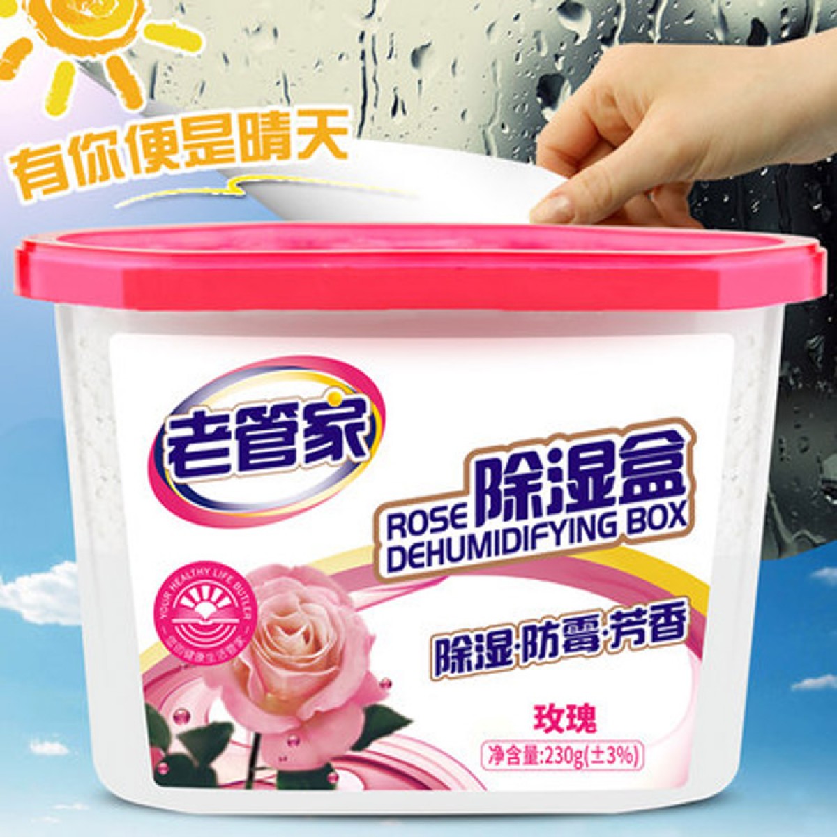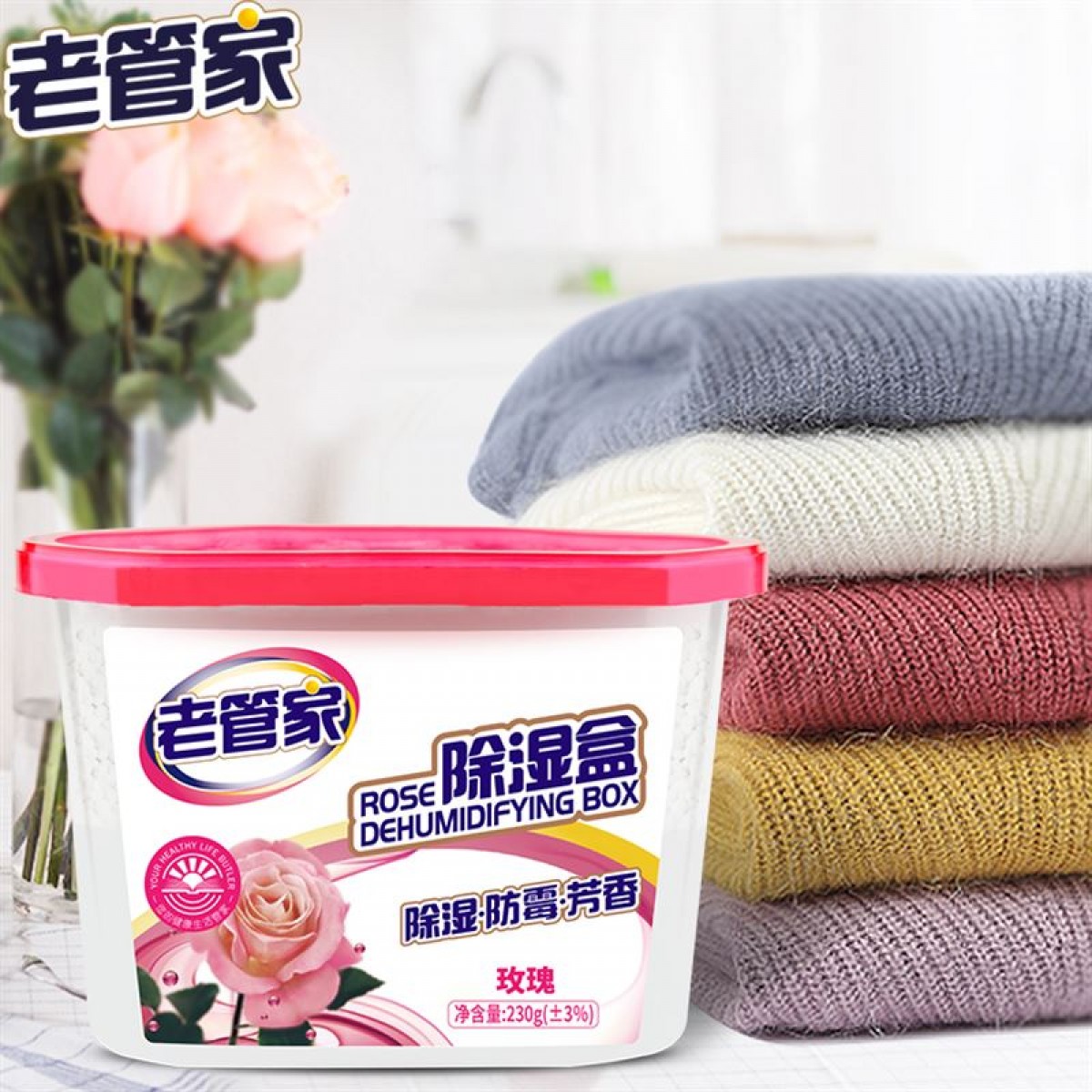 商品名称:老管家玫瑰香除湿盒干燥剂防潮剂衣柜吸湿盒衣物防霉抽湿230g*9盒