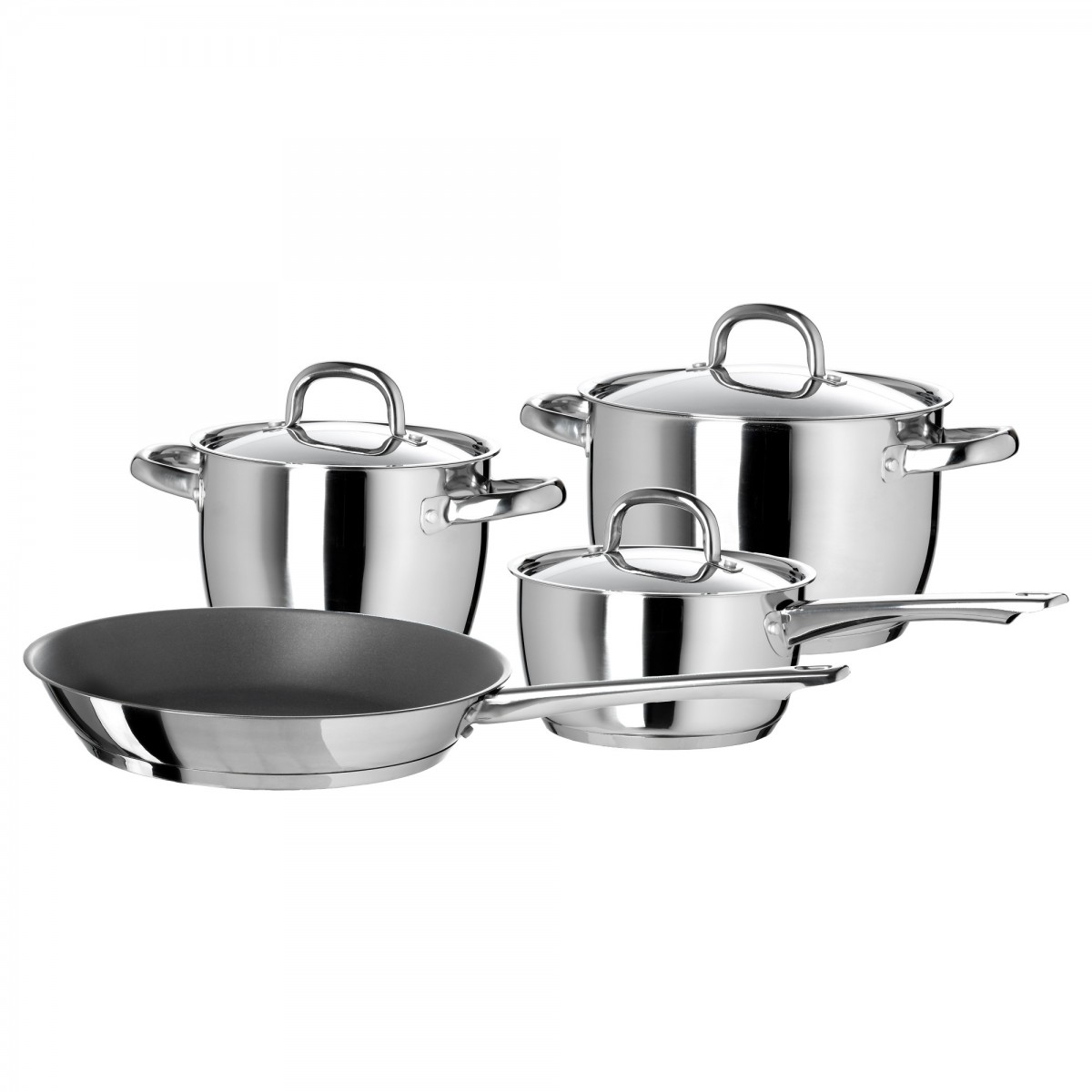 含有: 带盖锅5升,带盖锅3升,长柄带盖炖锅2升,平底煎锅直径 28cm。