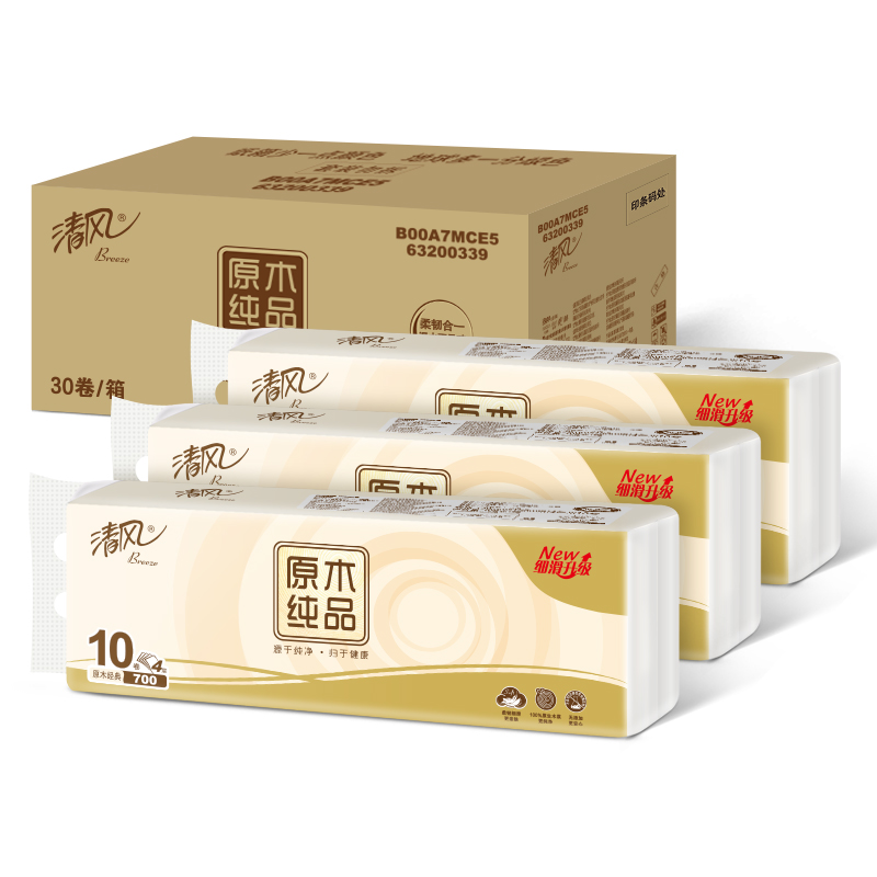商品名称:清风 无芯卷纸 原木纯品系列4层70克*30卷 卫生纸卷纸 纸巾(10卷*3提) 单位:组