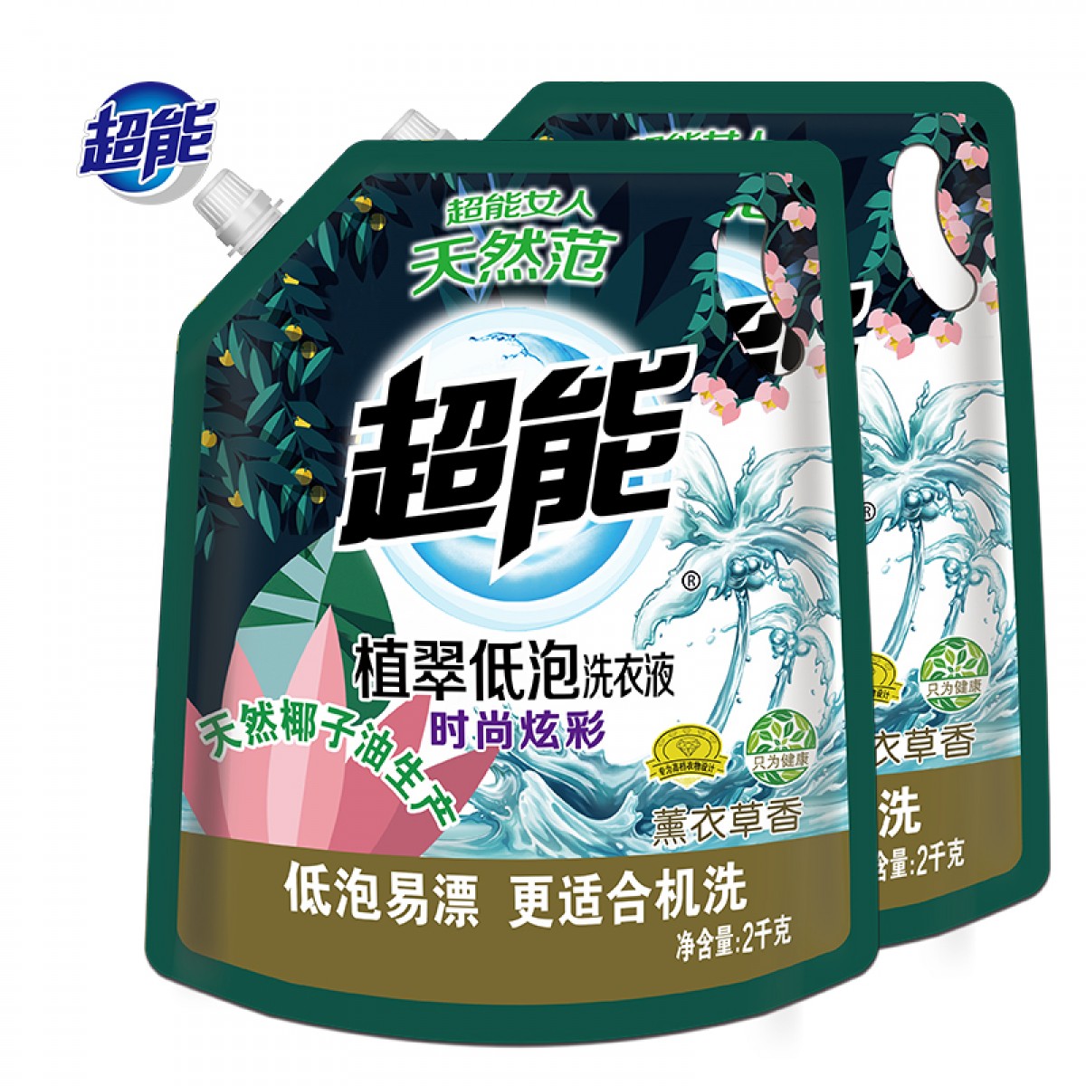 超能植翠低泡洗衣液袋装2kg*2时尚炫彩袋家庭量贩装