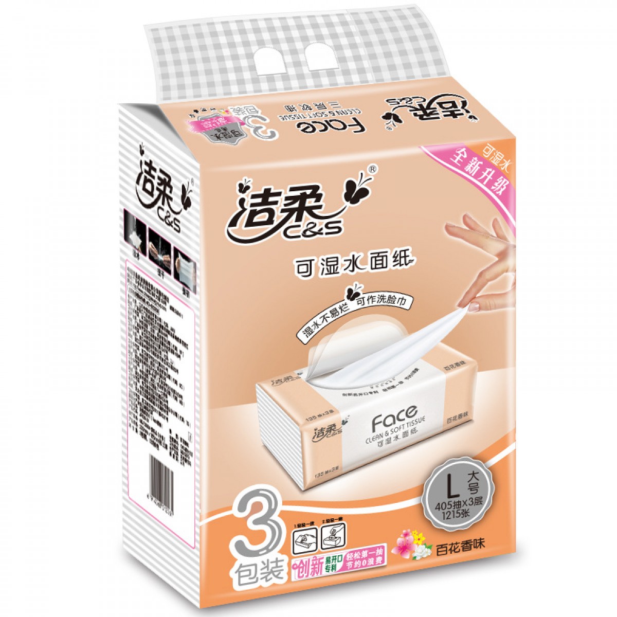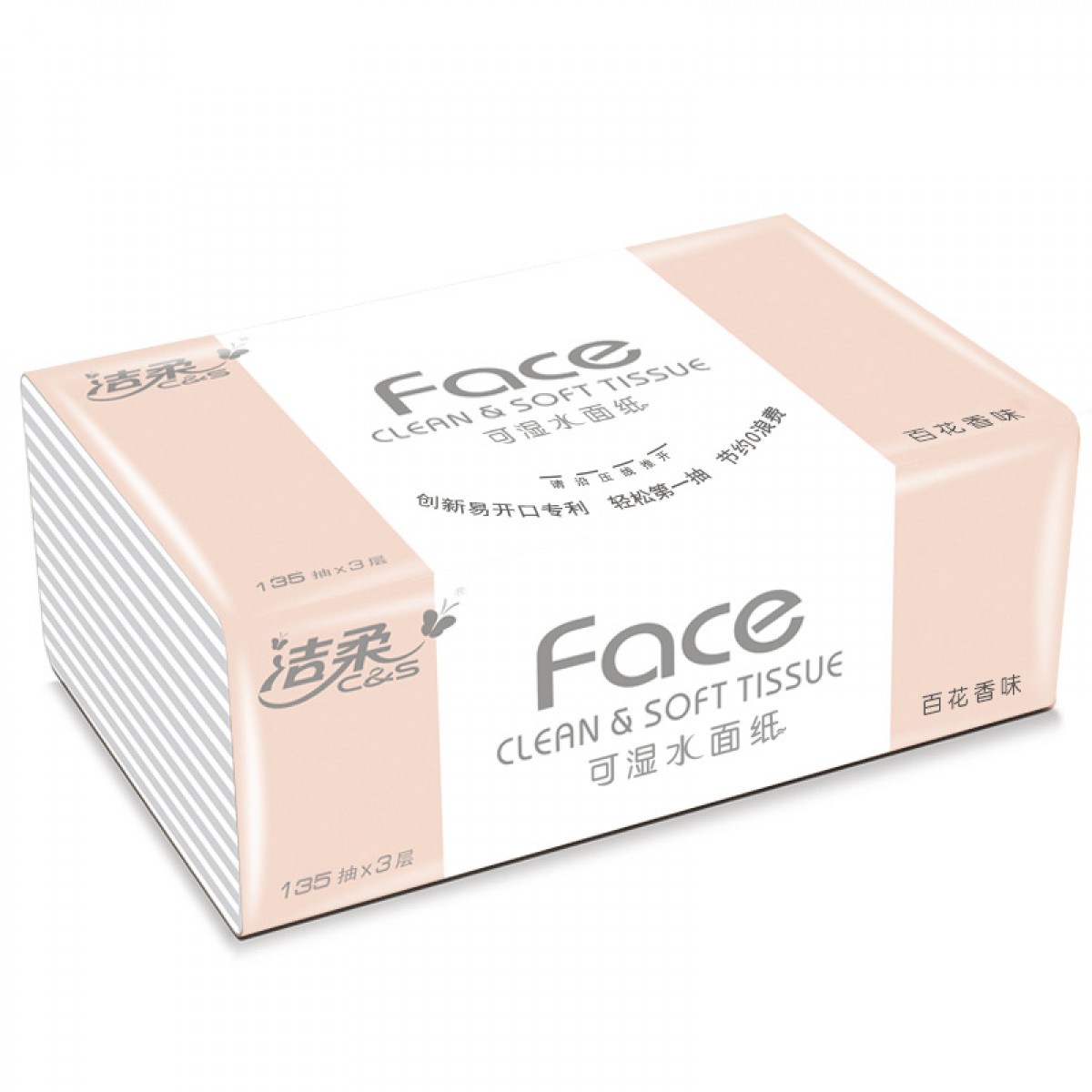 商品名称:洁柔 抽纸face可湿水面纸百花香味3层135抽家用3包餐巾纸