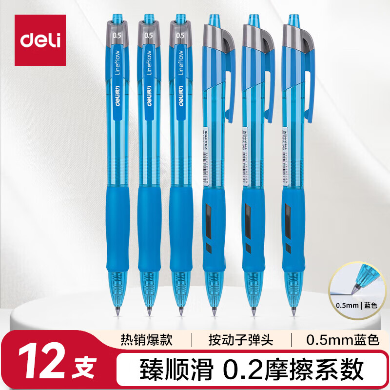 得力(deli)臻顺滑按动中性笔签字笔 办公用品 0.5mm子弹头 蓝色12支/盒S08 单位:盒
