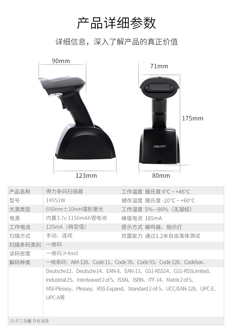 商品名称:得力 条码扫描枪一维码扫描器 14951W