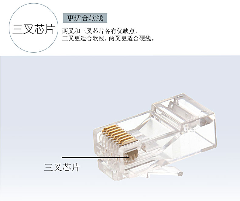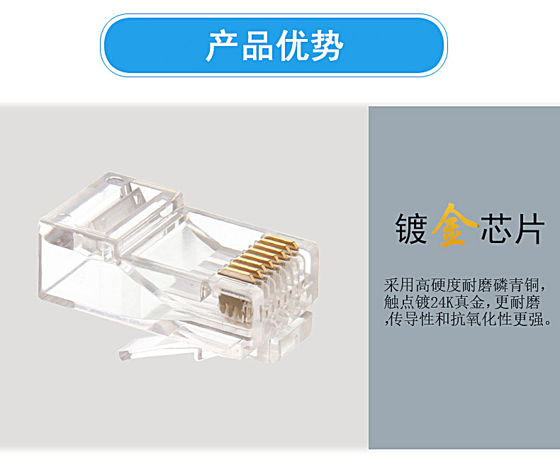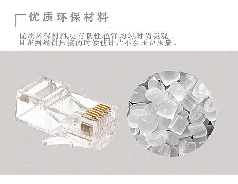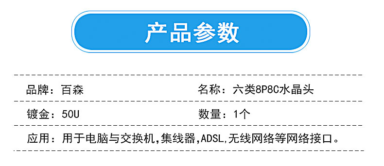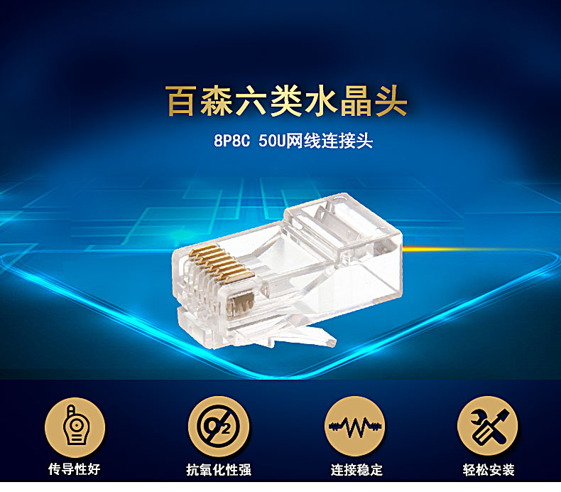 商品名称:BABSON/百森 网络非屏蔽六类水晶头rj45网线连接头8芯50u镀金