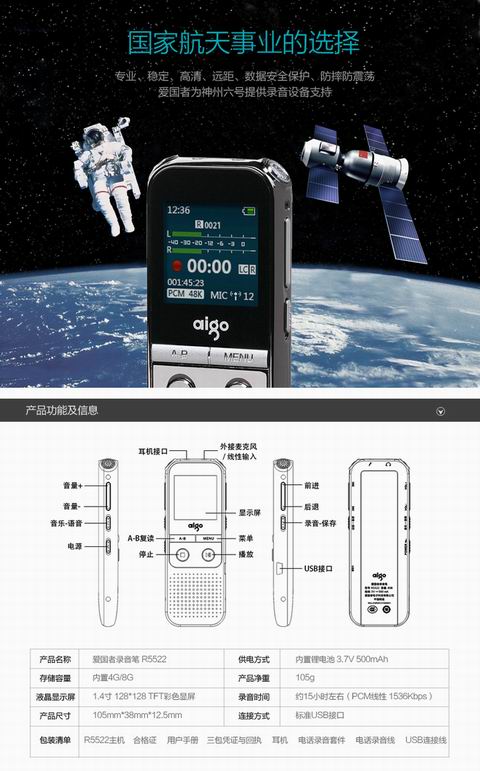 商品名称:☆爱国者 AIGO R5522 录音笔 16G 微型 专业高清远距降噪 声控 学习/会议采访取证录音 PCM高品质 锖色