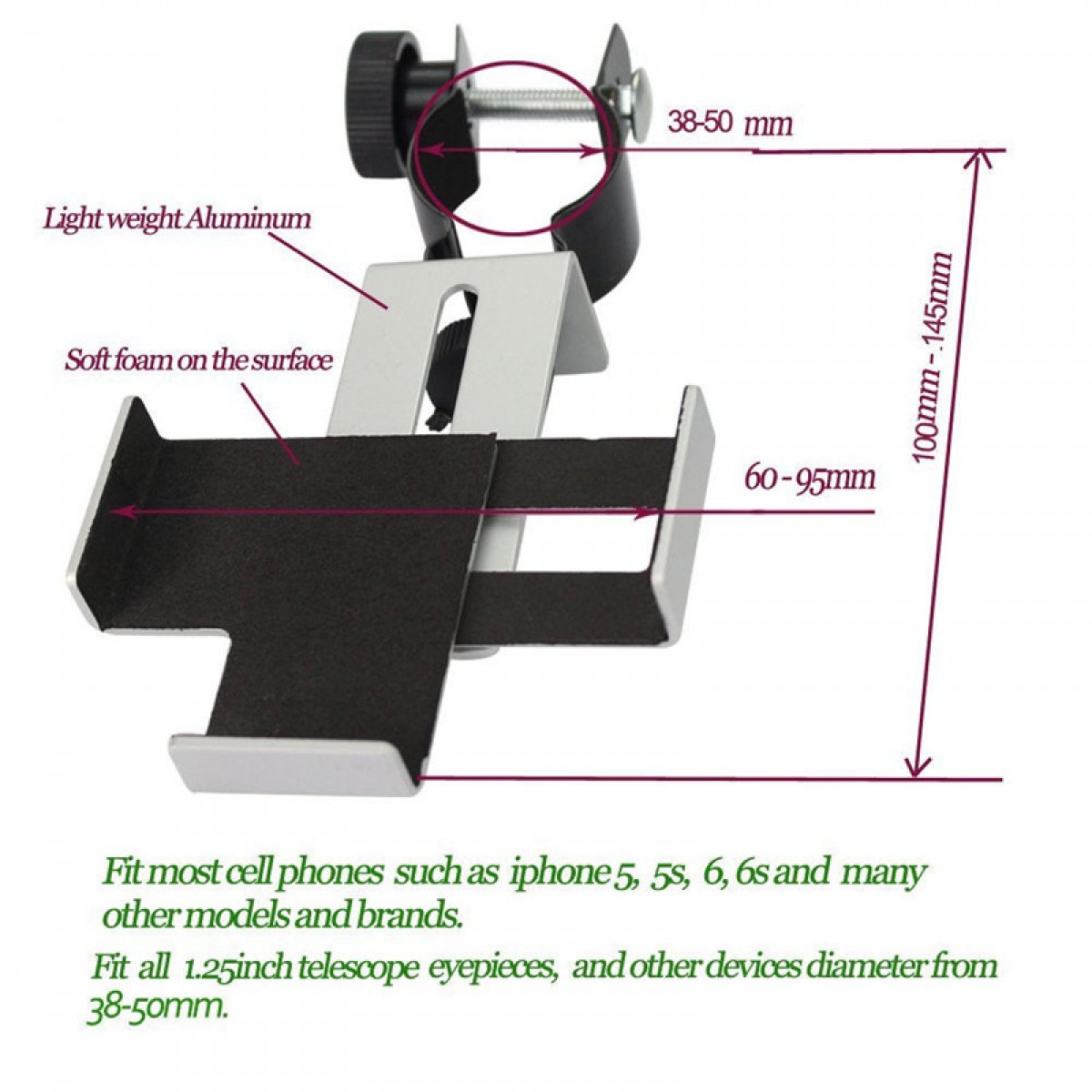 品牌:Datyson产地:中国材质:金属目镜夹具支持范围:38-50mm手机夹具支持宽度:60-95mm颜色:银色配黑色(如图)净重:102g毛重:124g
