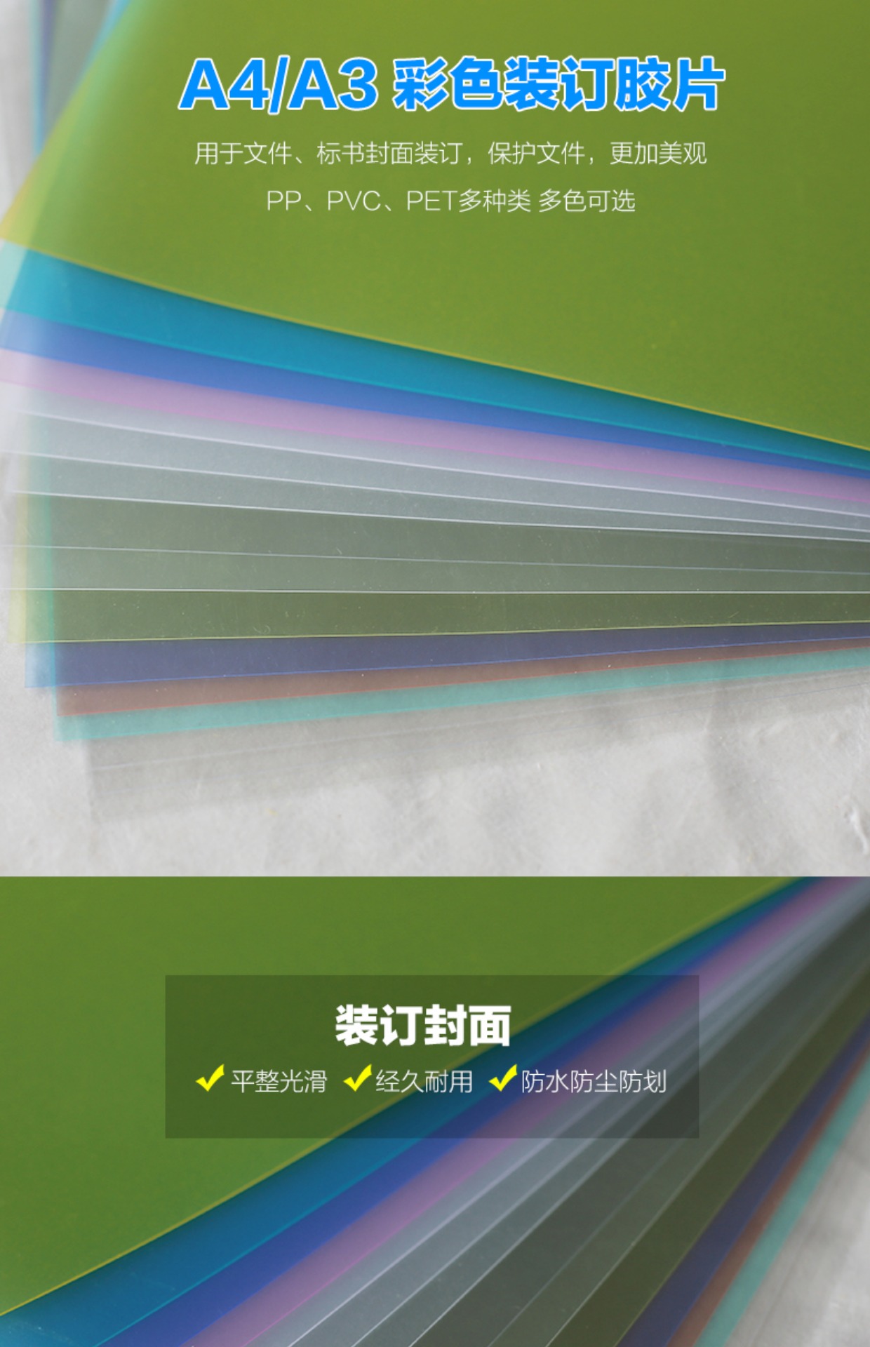 商品名称:道顿 A3/A4幅面 透明磨砂彩色多功能装订胶片 标书 文件 合同 报告 塑料胶圈 铁圈 夹条封面封皮装订