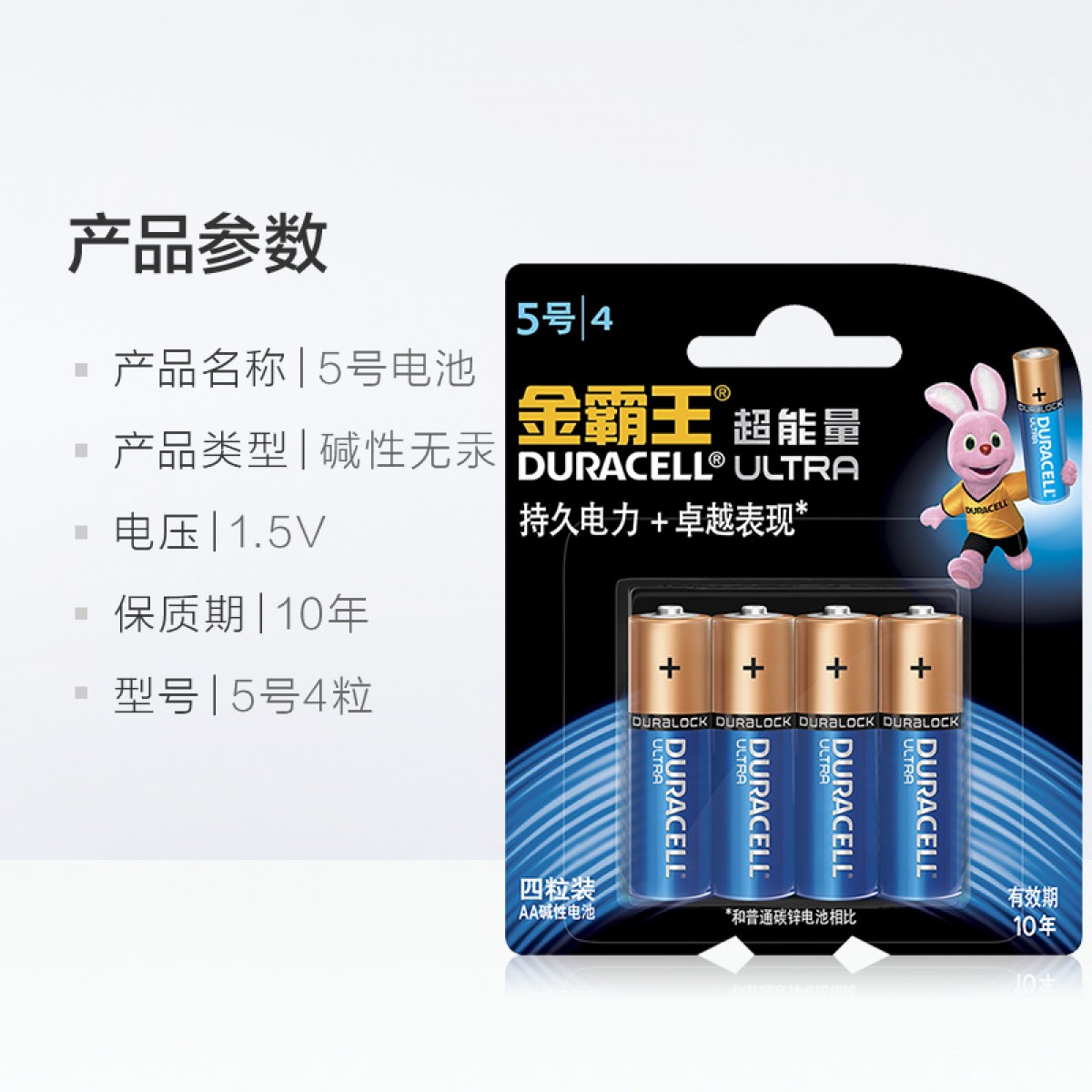 商品名称:金霸王 超能量AA5号电池碱性电池4粒装