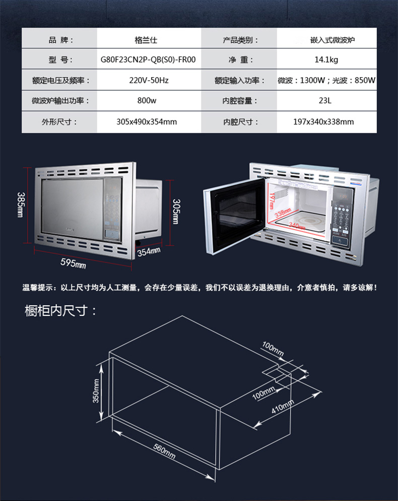 商品名称:格兰仕 家用嵌入式微波炉烤箱一体 G80F23CN2P-QB(SO)-FROO
