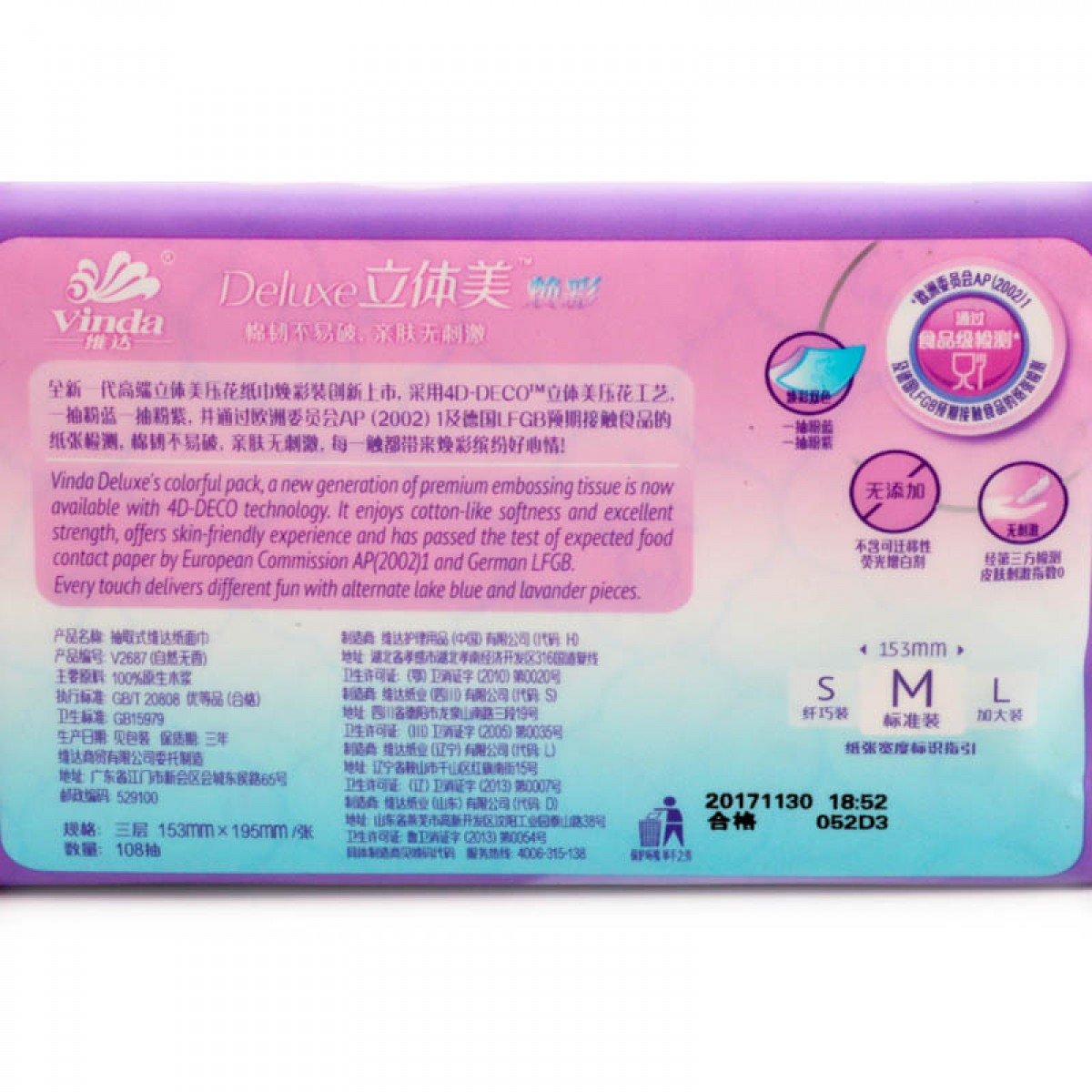 商品名称:维达 抽纸立体美焕彩装3层纸巾M码108抽18包 面巾纸无香餐巾纸
