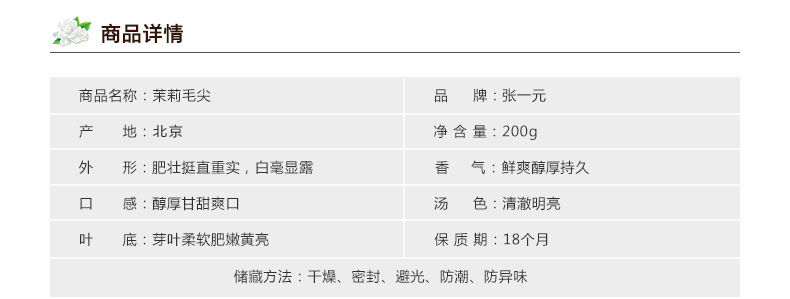 商品名称:张一元 花茶 茶叶 茉莉花茶叶 罐装茉莉毛尖200g