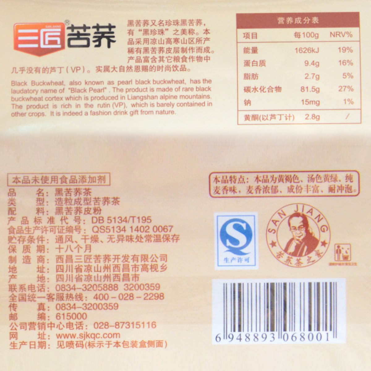 商品名称:三匠 黑苦荞茶200g*2盒 四川凉山荞麦茶