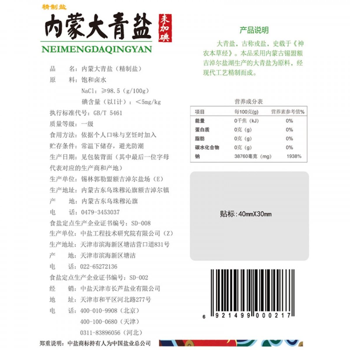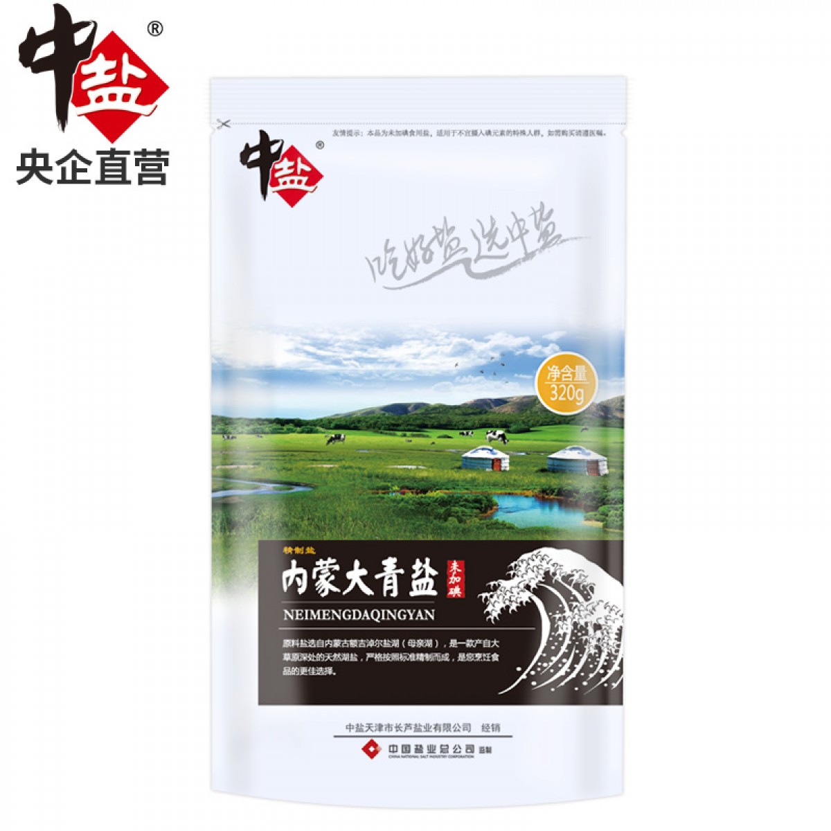 商品名称:中盐 内蒙大青盐320g/袋未加碘精制食用盐无碘大青盐家用无抗结剂