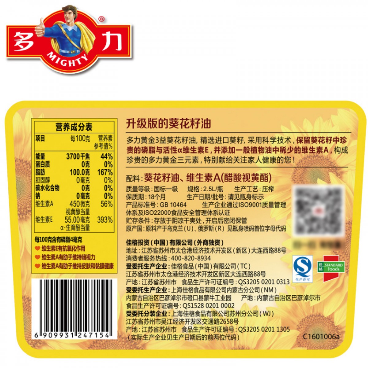 商品名称:多力 黄金三益葵花籽油2.5L/桶 充氮保鲜物理压榨