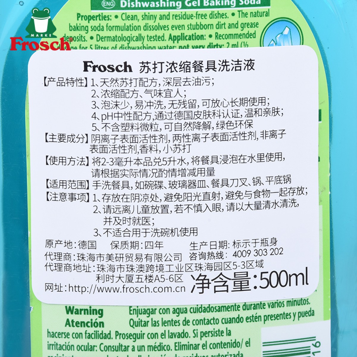 商品名称:Frosch/菲洛施 苏打浓缩餐具洗洁液洗洁精洗碗液 500ml