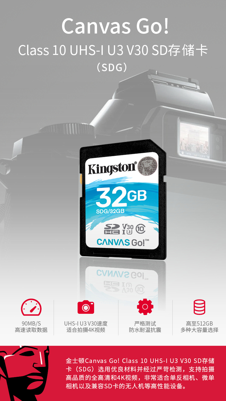 商品名称:金士顿 SDHC卡SDG 存储卡相机内存卡U3支持4K读90M 32G