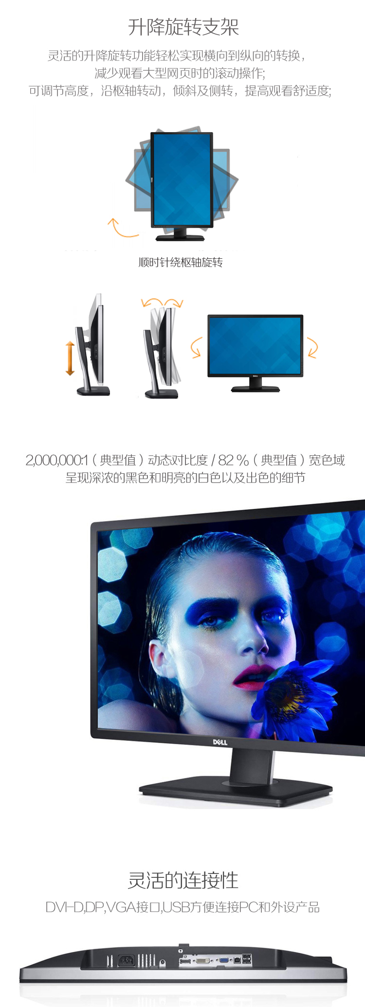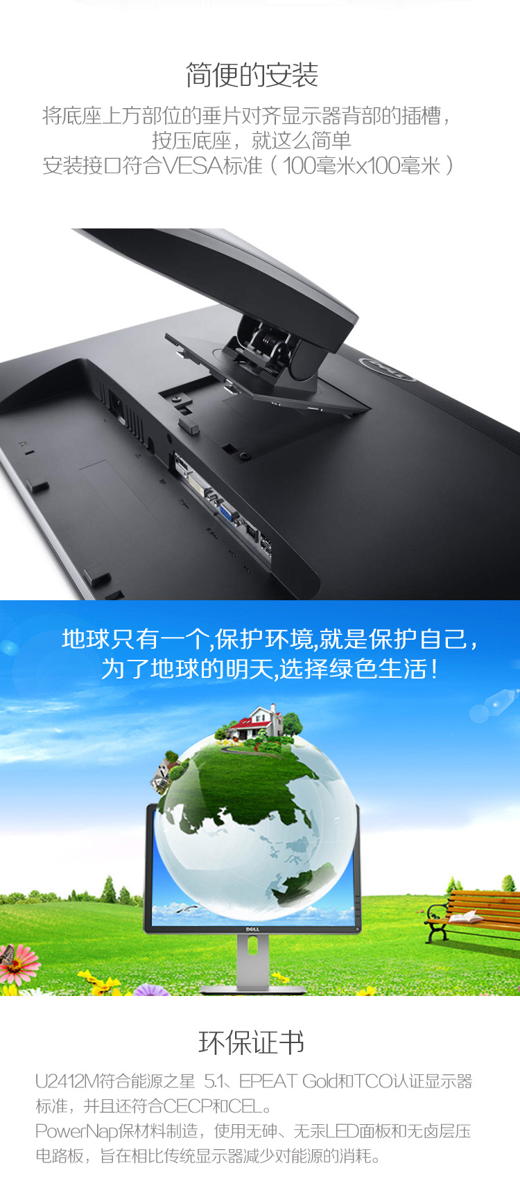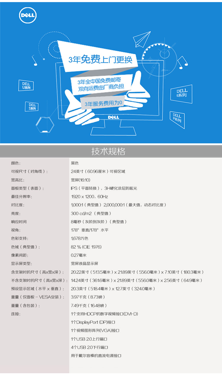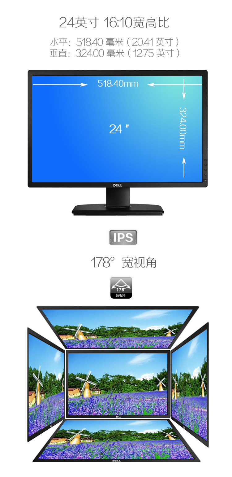 商品名称:戴尔/Dell 24英寸16:10屏幕比例旋转升降IPS屏显示器 U2412M