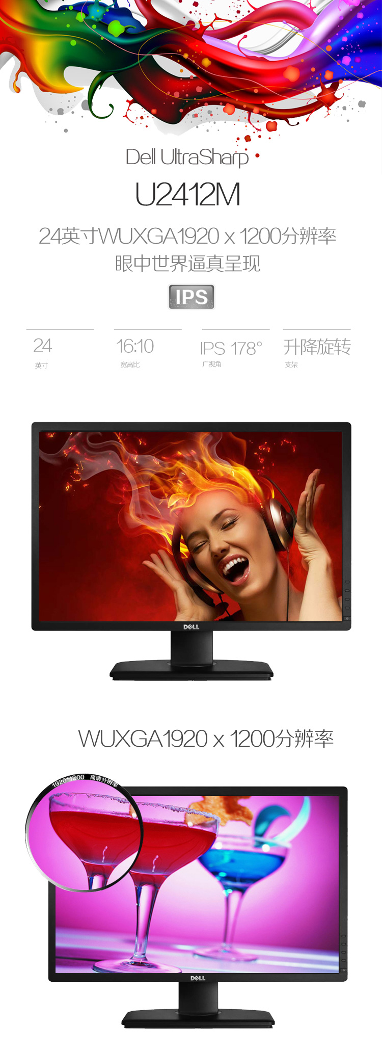 戴尔/Dell 24英寸16:10屏幕比例旋转升降IPS屏显示器 U2412M