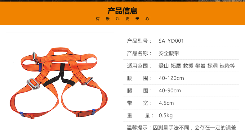 商品名称:援邦 半身安全腰带户外攀岩速降装备高空作业安全腰带保险登山护腰 SA-YD001
