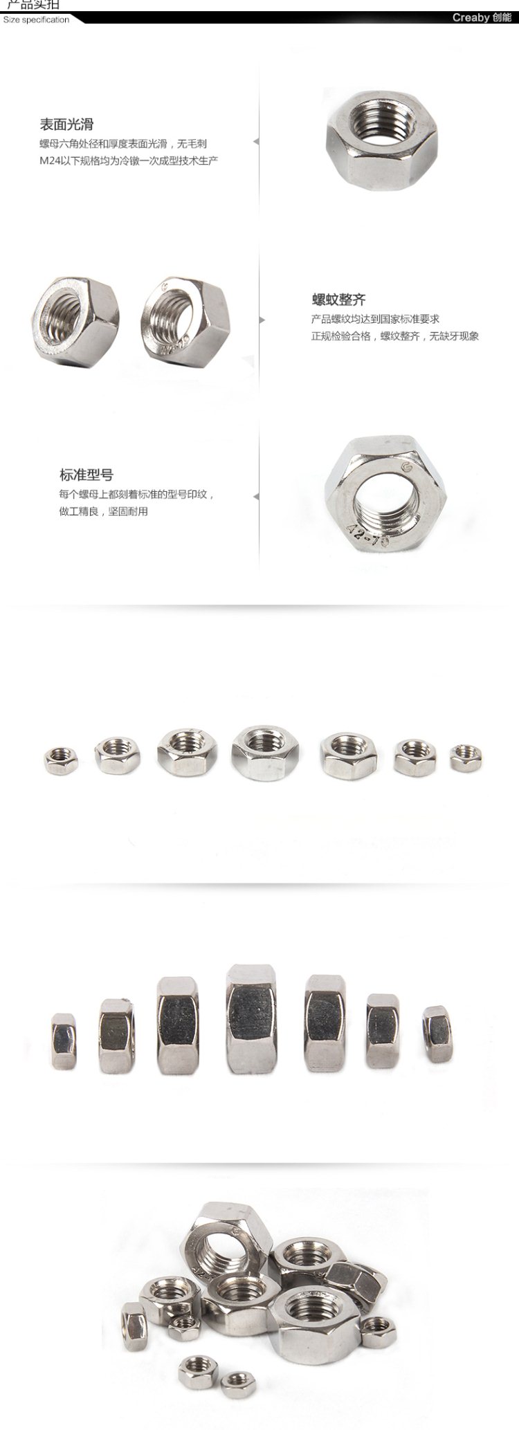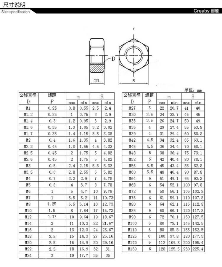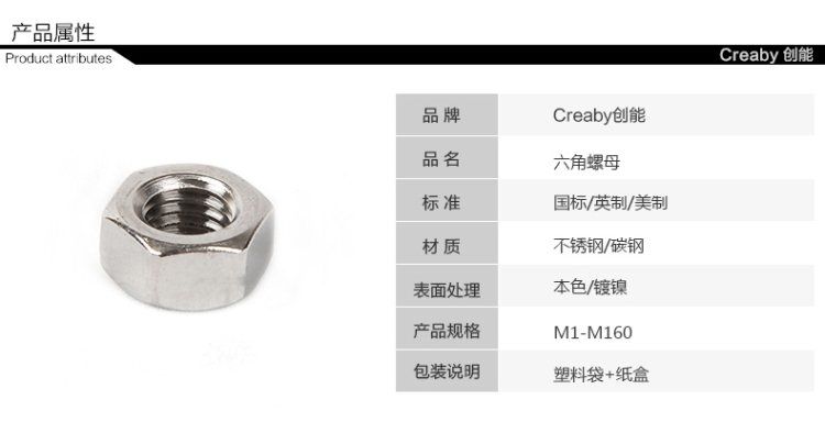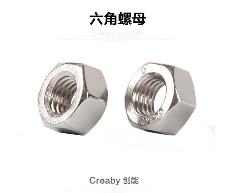 商品名称:Creaby/创能 100只 螺栓帽 螺帽螺丝帽 镀镍六角螺母 M2-M6
