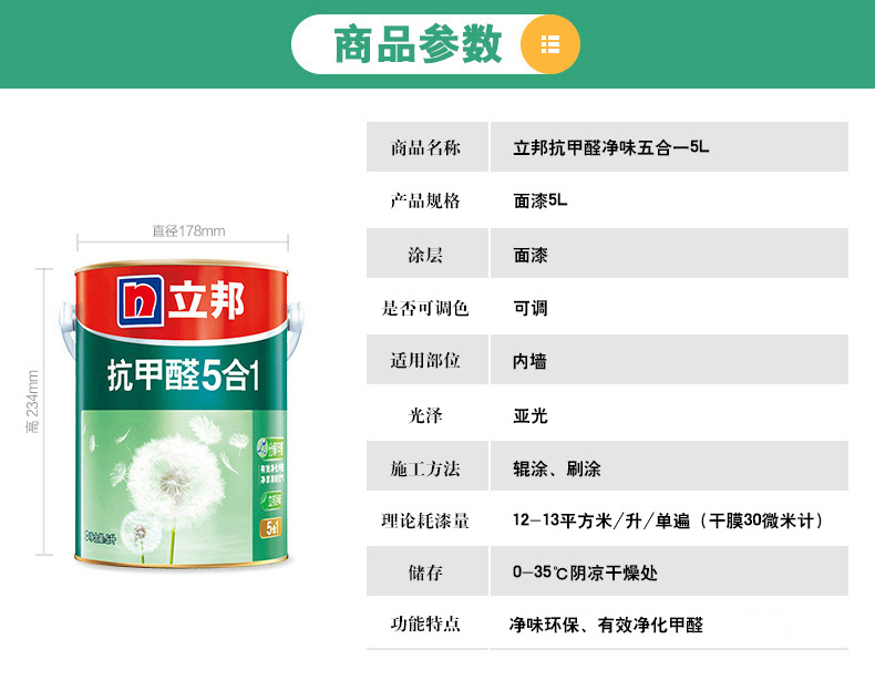 商品名称:立邦漆 抗甲醛净味五合一内墙面漆 室内乳胶漆油漆涂料5L
