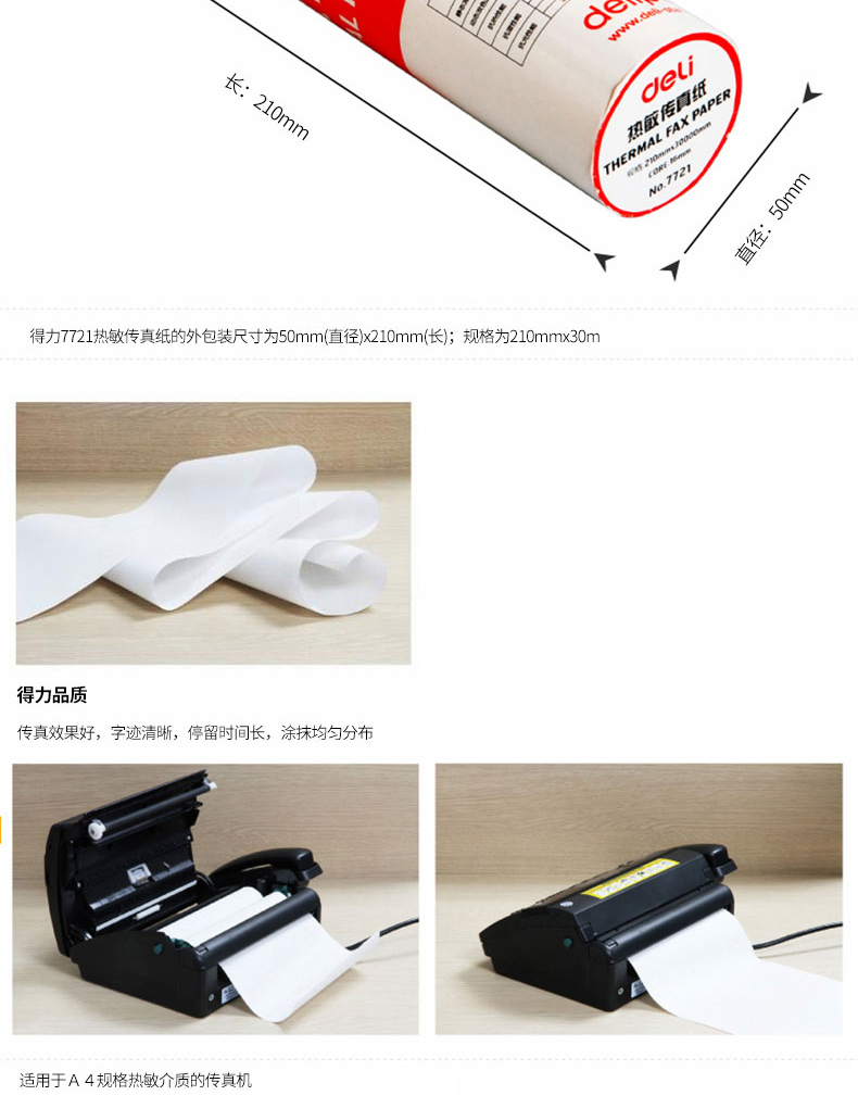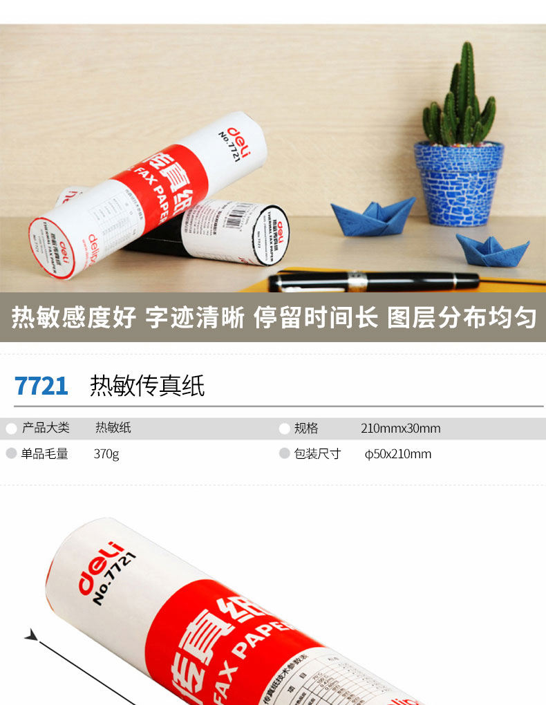 商品名称:得力 7721 经济型热敏传真纸 铜版纸 210mm*30m