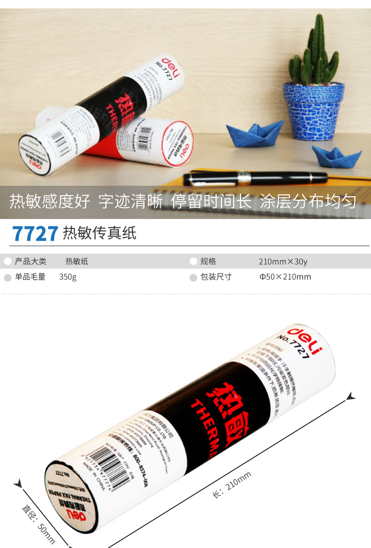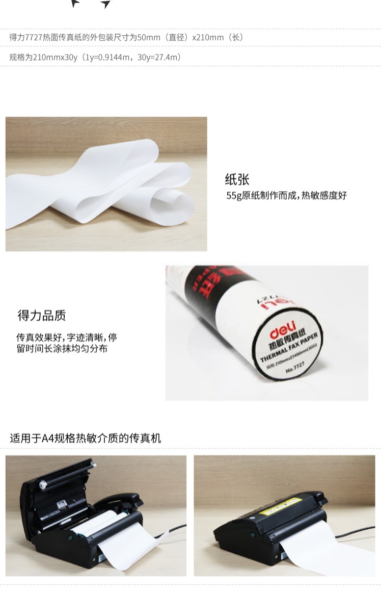 商品名称:得力 7727 热敏传真纸传真机A4用纸210mm*27.4m 单筒装 不易褪色