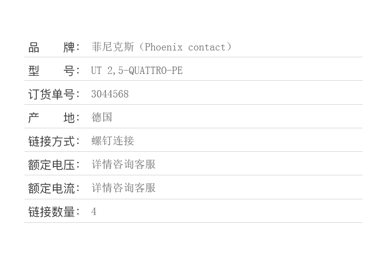 商品名称:菲尼克斯 接线端子螺钉连接2.5 平方 UT 2.5-QUATTRO-PE-3044568