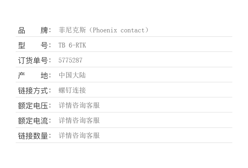 商品名称:菲尼克斯 接线端子螺钉连接 TB 6-RTK-5775287