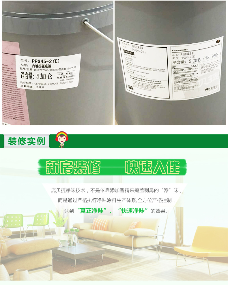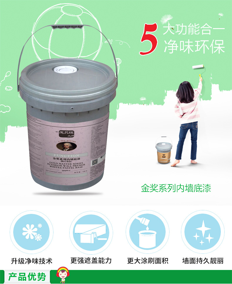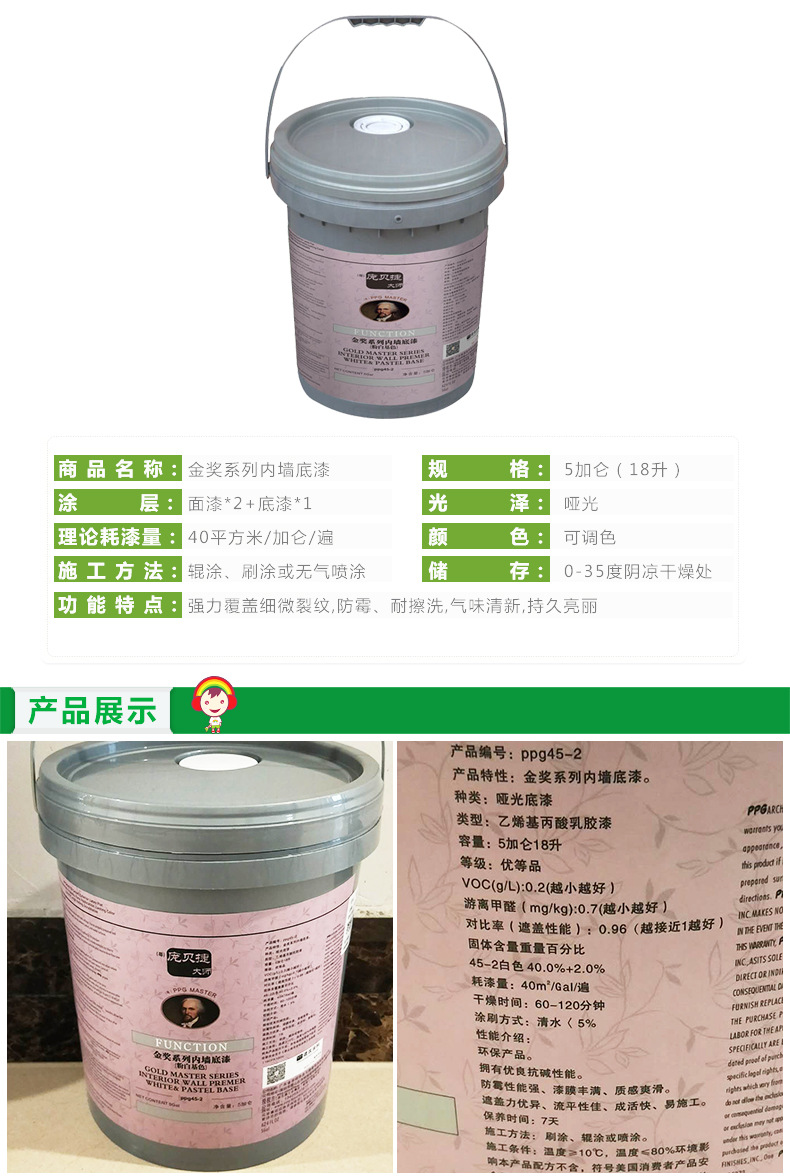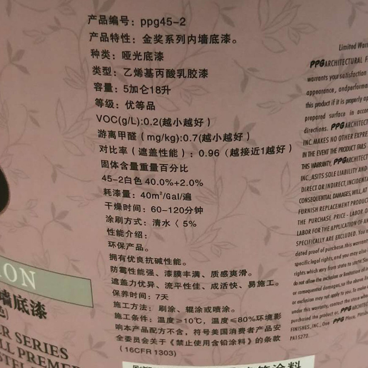 商品名称:庞贝捷 大师漆金奖系列抗碱底漆防霉气味清新持久亮丽环保内墙涂料 ppg45 -2(E)