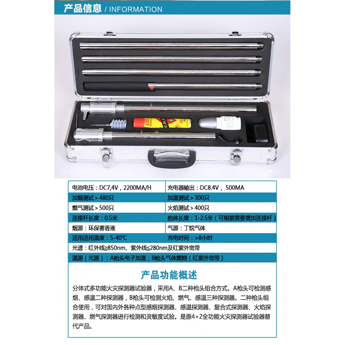 分体式多功能火灾探测器试验器,采用A、B二种枪头组合方式。A枪头可检测感烟、感温二种探测器,B枪头可检测火焰、燃气、感温三种探测器。二种枪头组合使用,可对国内外各种点型感烟探测器、感温探测器、复合式探测器、火焰探测器、燃气探测器进行检测和灵敏度试验。是原4+2全功能火灾探测器试验器替代产品。