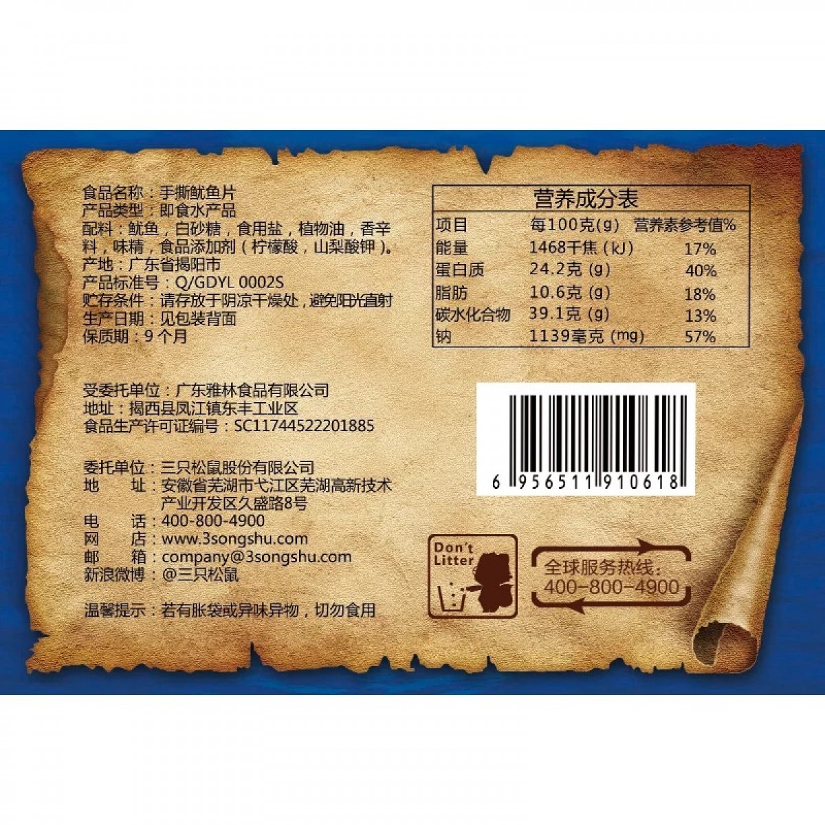 商品名称:三只松鼠 零食手撕鱿鱼片60g 鲜香原味海味即食鱿鱼丝风琴鱿鱼