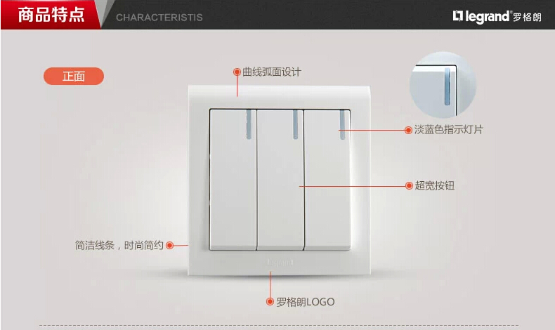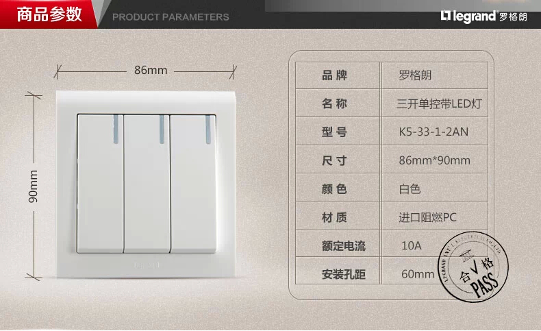 商品名称:罗格朗 开关插座 K5系列 86型三开单控带LED灯墙壁开关面板