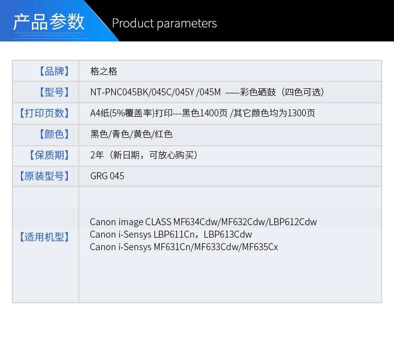 商品名称:格之格 CRG-045c硒鼓 MF635Cx 633Cdw 631Cn MF634CDW 打印机墨盒