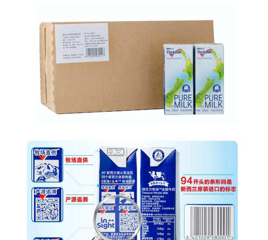 商品名称:纽仕兰/the land 3.5g蛋白质 全脂纯牛奶250ml*24家庭装*2箱