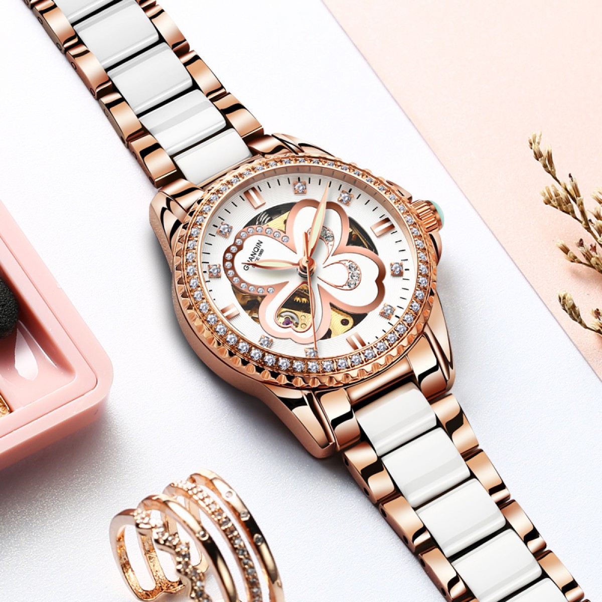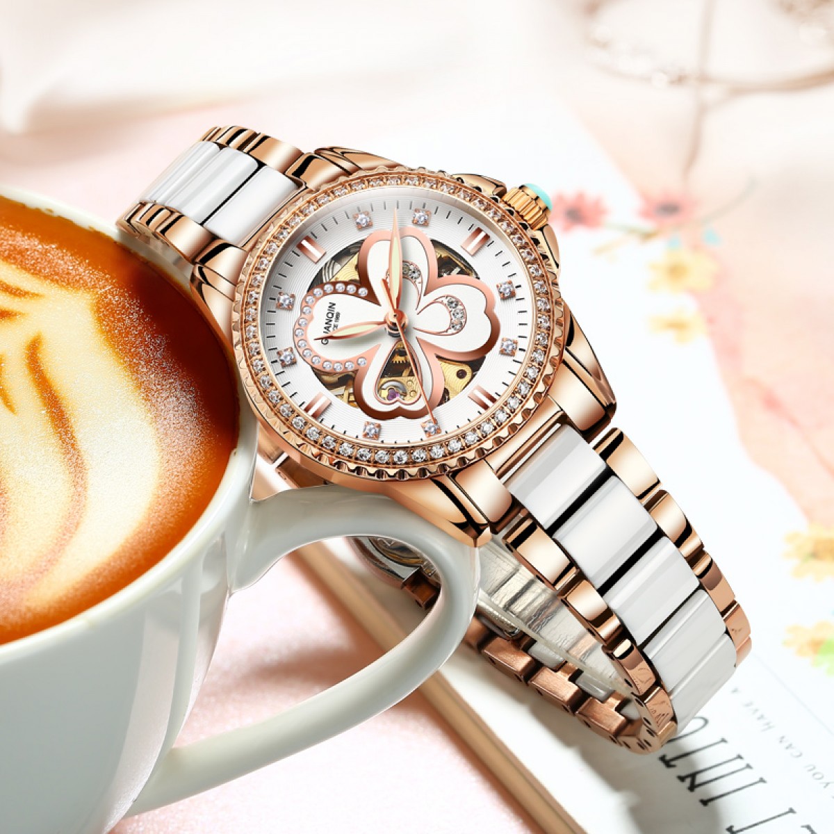 冠琴 四叶草女机械表潮流手表 女防水夜光真牛皮腕表