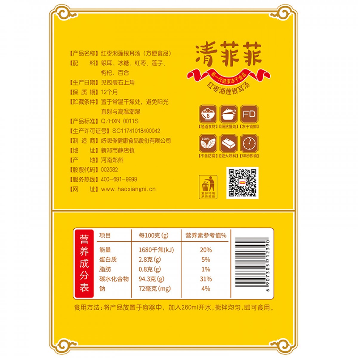 商品名称:好想你 清菲菲礼盒红枣湘莲银耳汤冻干364g 冲泡速食方便食品早餐