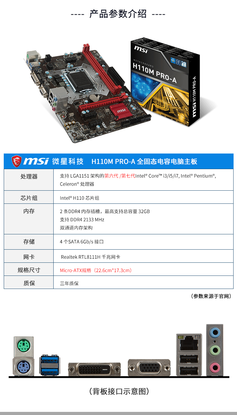 商品名称:★ 微星/MSI 主板(Intel H110/LGA 1151)H110M PRO-A