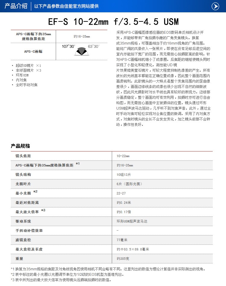 商品名称:佳能 超广角风景变焦单反镜头 EF-S 10-22mm f3.5-4.5