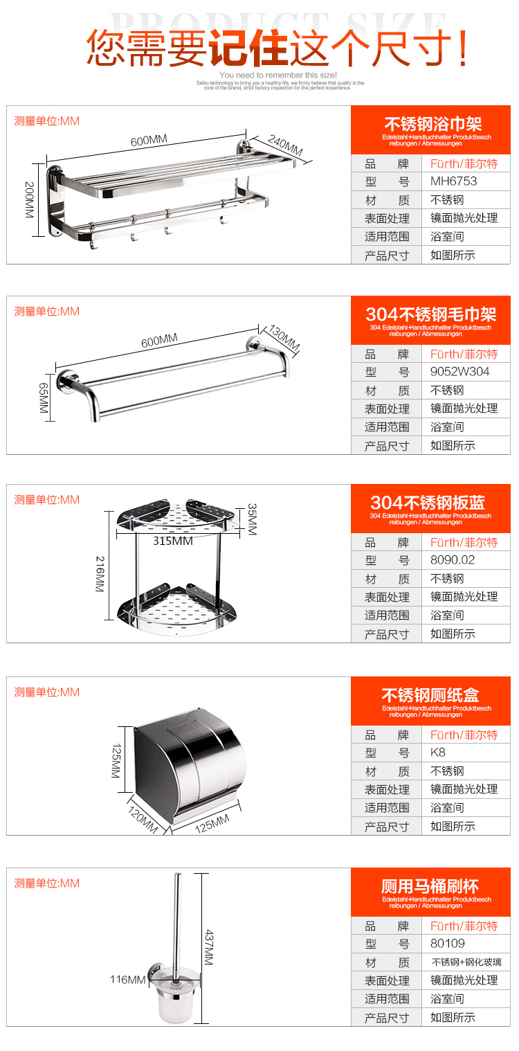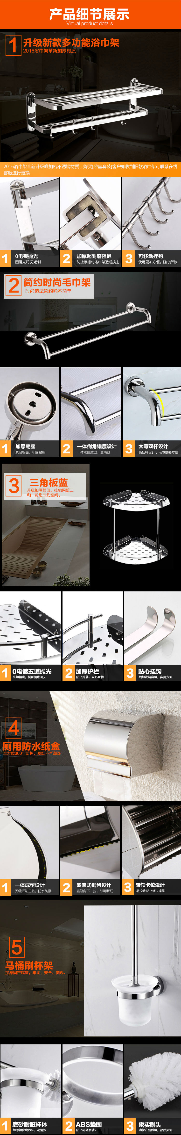 商品名称:菲尔特 不锈钢浴室五金挂件套装 毛巾架浴巾架置物架 五件套 TZ505