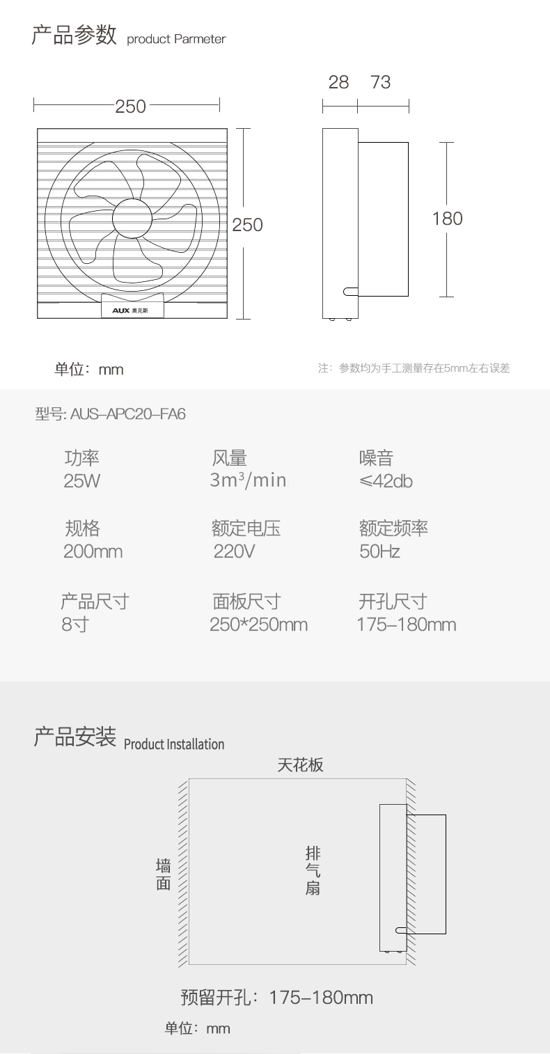 商品名称:奥克斯 换气扇家用静音8寸 AUX-APC20-FA8