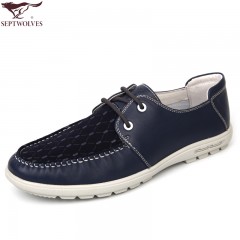 七匹狼 男鞋头层牛皮拼接男士时尚白底休闲蓝色系带真皮皮鞋子
