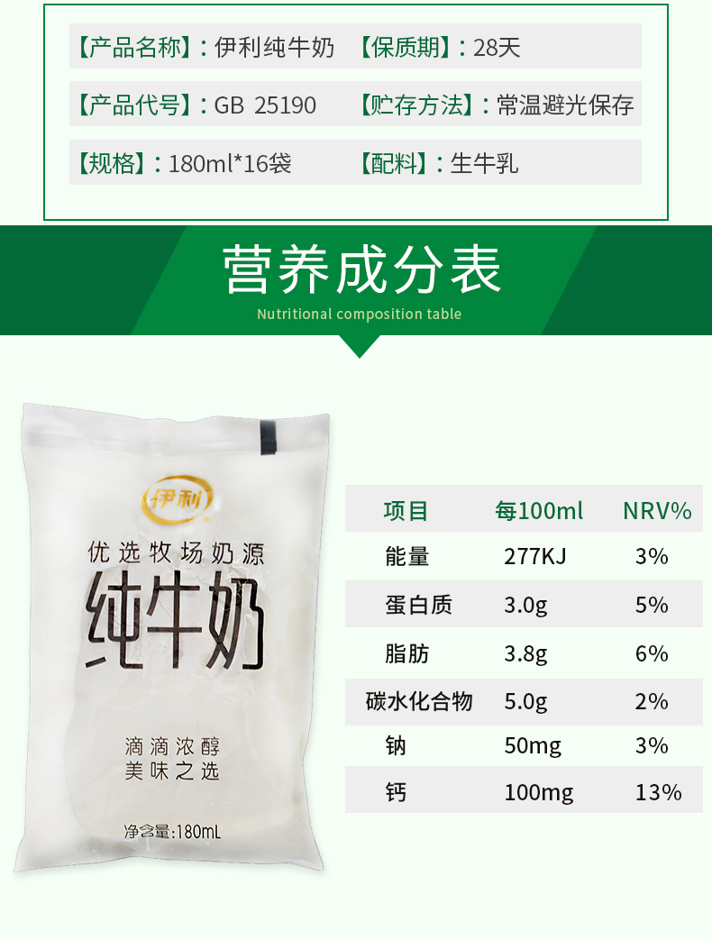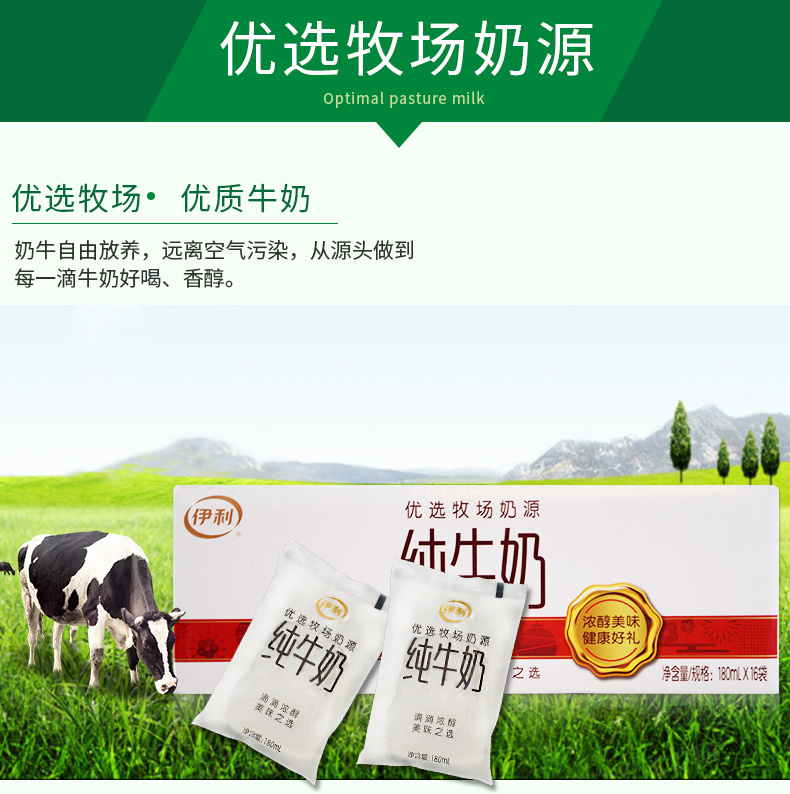 商品名称:伊利 纯牛奶袋装 180ml