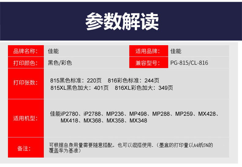 商品名称:★ 佳能/Canon CL-816XL 彩色 大容量墨盒 适用于iP2780 iP2788 MP236 MP498 MP288 MP259 MX428 MX418 MX368 MX358 MX348 打印量349页