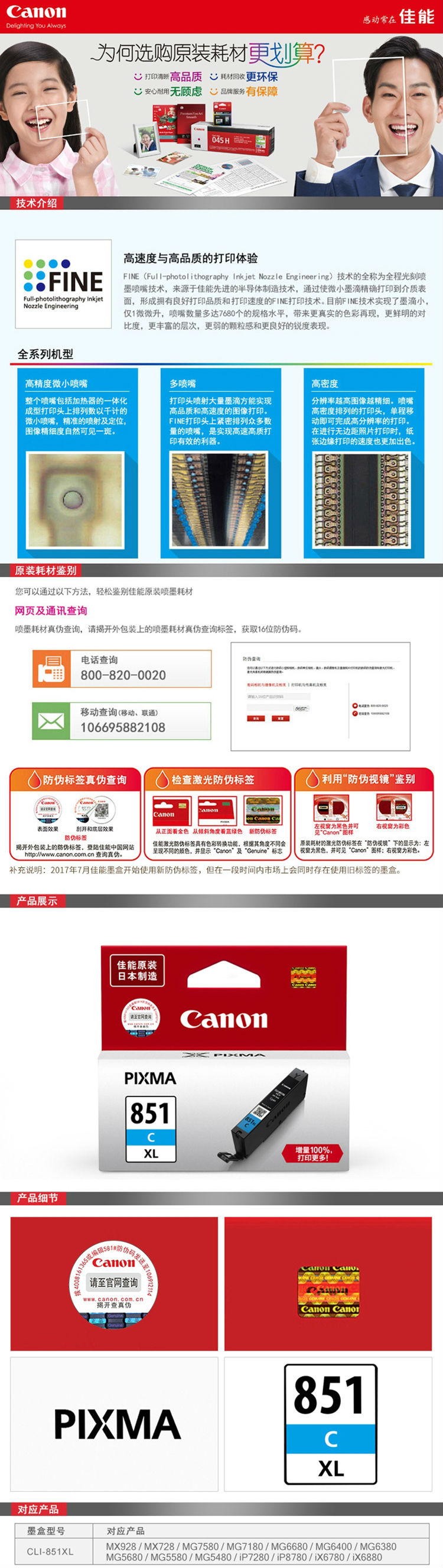 商品名称:★ 佳能/Canon CLI-851XL C 青色 大容墨盒 适用于MX928 728 MG7580 7180 6680 6400 6380 5680 5580 5480 IP7280 8780 IX6780 6880 打印量670页